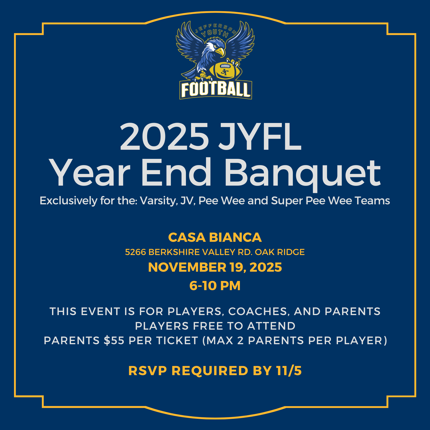 Join us for the Jefferson Youth Football End of Year Banquet as we celebrate an amazing season with our 5thβ8th grade teams!